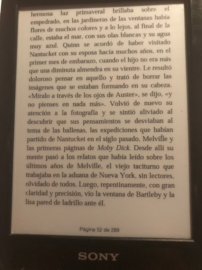En el avión de una aerolínea de bajo coste alguien que podría ser yo releía, en un lector de libros electrónicos Sony del año 2012 y como si fuera la primera vez, La ciudad de cristal de Paul Auster. En un pasaje de la página 52 el narrador, Quinn, se dice a sí mismo ante el doloroso recuerdo que evoca una enorme foto en una estación: Míralo a través de los ojos de Paul Auster.
