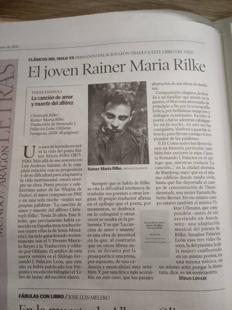 Reseña de Íñigo Linaje en Heraldo de Aragón sobre «La canción de amor y muerte del alférez Christoph Rilke»